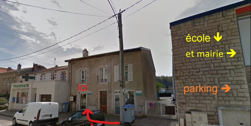 Parking, derrière la mairie, reprendre la rue principale vers la droite, passer l'école, c'est au Foyer Michel PERNEL, juste avant la pharmacie. Voir la photo.