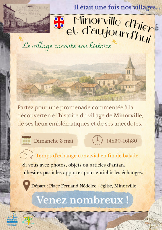 Venez découvrir les lieux emblématiques de Minorville, ses anecdotes cachées et son évolution au fil du temps. Que vous soyez un habitant de longue date ou un simple curieux, cette balade est l'occasion parfaite de porter un nouveau regard sur notre patrimoine.